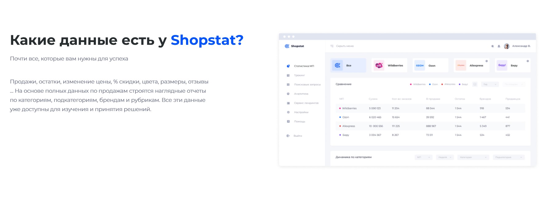 Shopstat – сервис аналитики продаж для Ozon и WildBerries. Анализ дает представление о продажах, позволяет планировать поставки на основании сведений об остатках, менять ассортимент и сравнивать свой бренд с конкурентами.