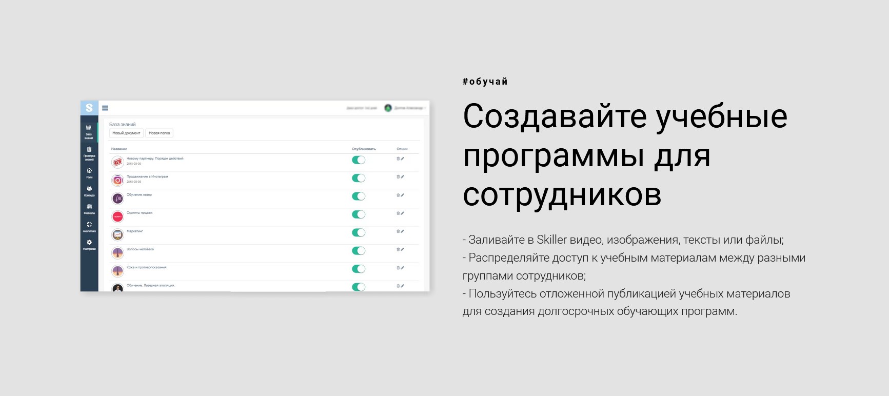 - Загрузка обучающих материалов для учебных программ в любом формате. Отложенная публикация для создания долгосрочных программ.