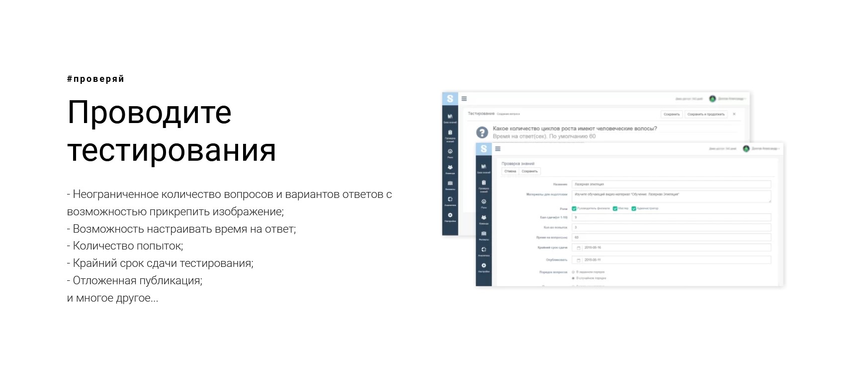 - Создание тестов для проверки знаний. Настройка времени ответов, количества попыток, сроков сдачи теста.