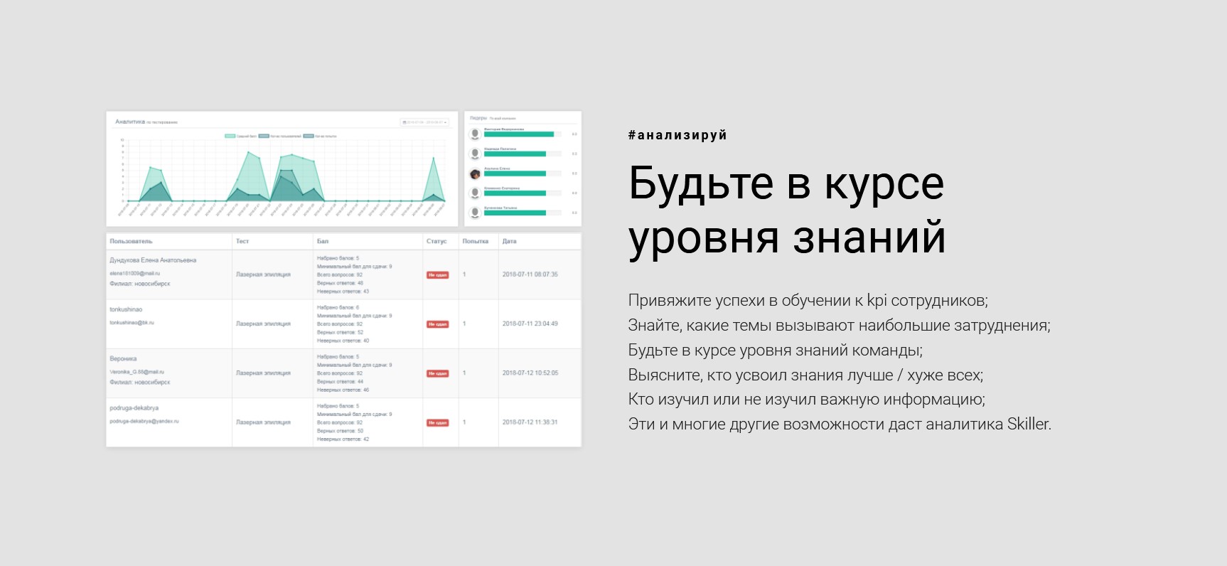 - Подробная отчетность по усвоению материала, выявление проблем, привязка результатов тестирования к КПИ.