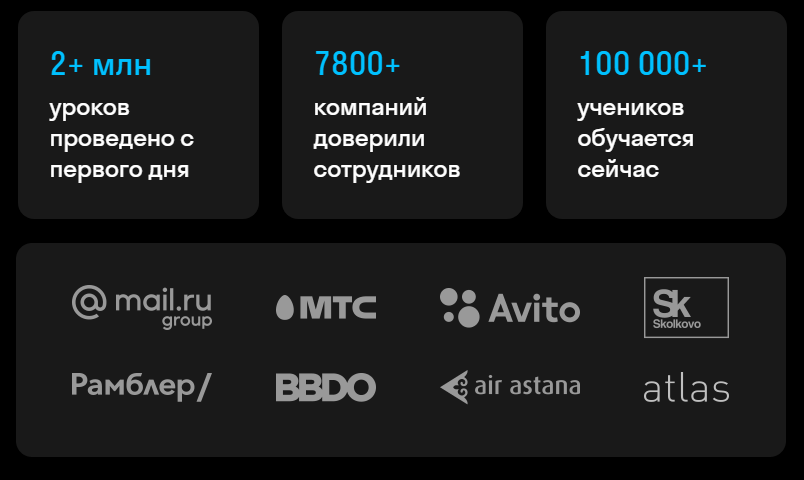 Более 7 тыс. компаний уже обучили или продолжают обучать своих сотрудников в Skyeng, в том числе такие гиганты рынка как Рамблер и МТС.