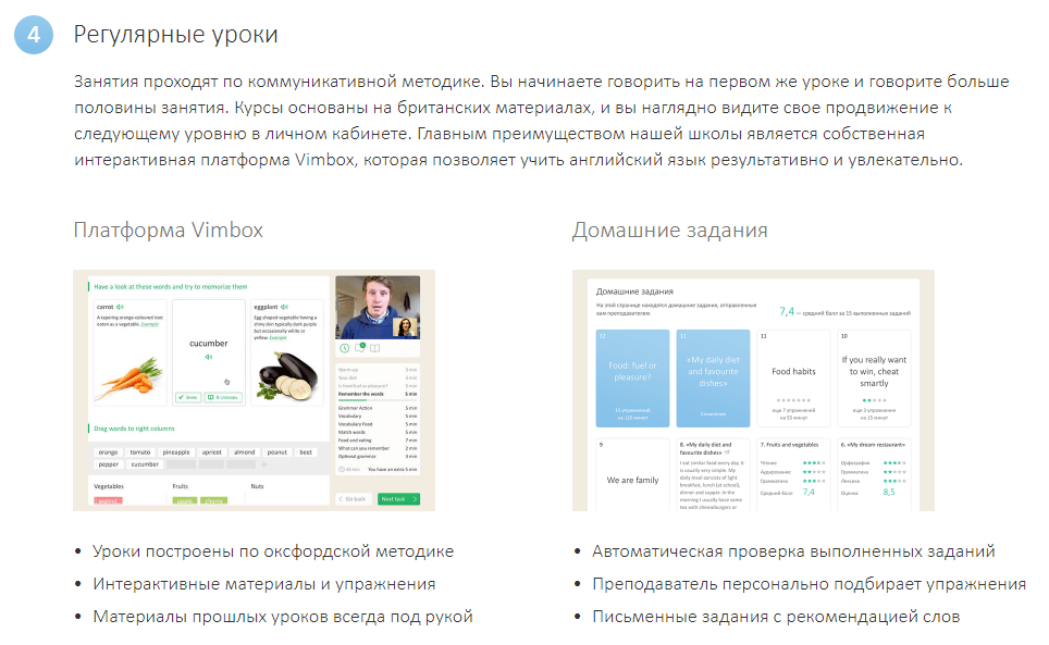 Своим главным преимуществом Skyeng считает собственную интерактивную платформу Vimbox, которая позволяет учить английский язык результативно и увлекательно. Впрочем, при желании клиента, уроки могут проводиться через Скайп.