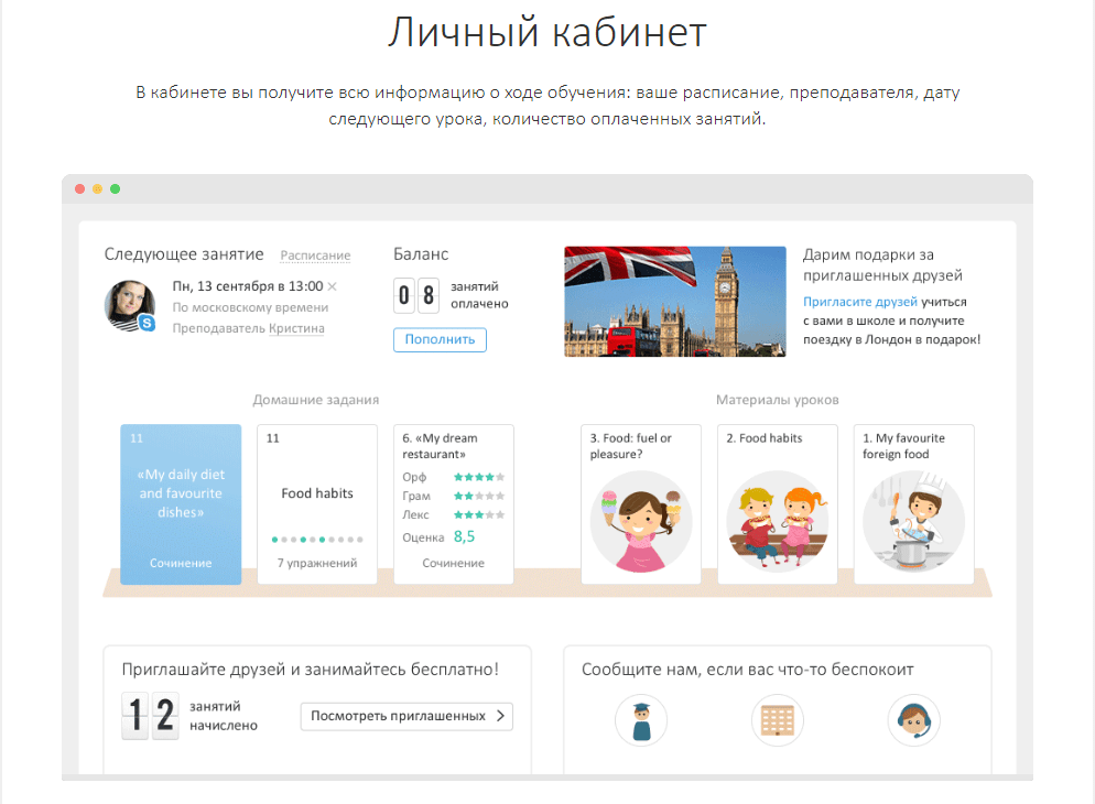 Зайдя на сайт можно изучить принципы обучения, записаться на пробный урок, увидеть отзывы довольных клиентов и получить дополнительные материалы, касающиеся английского языка.