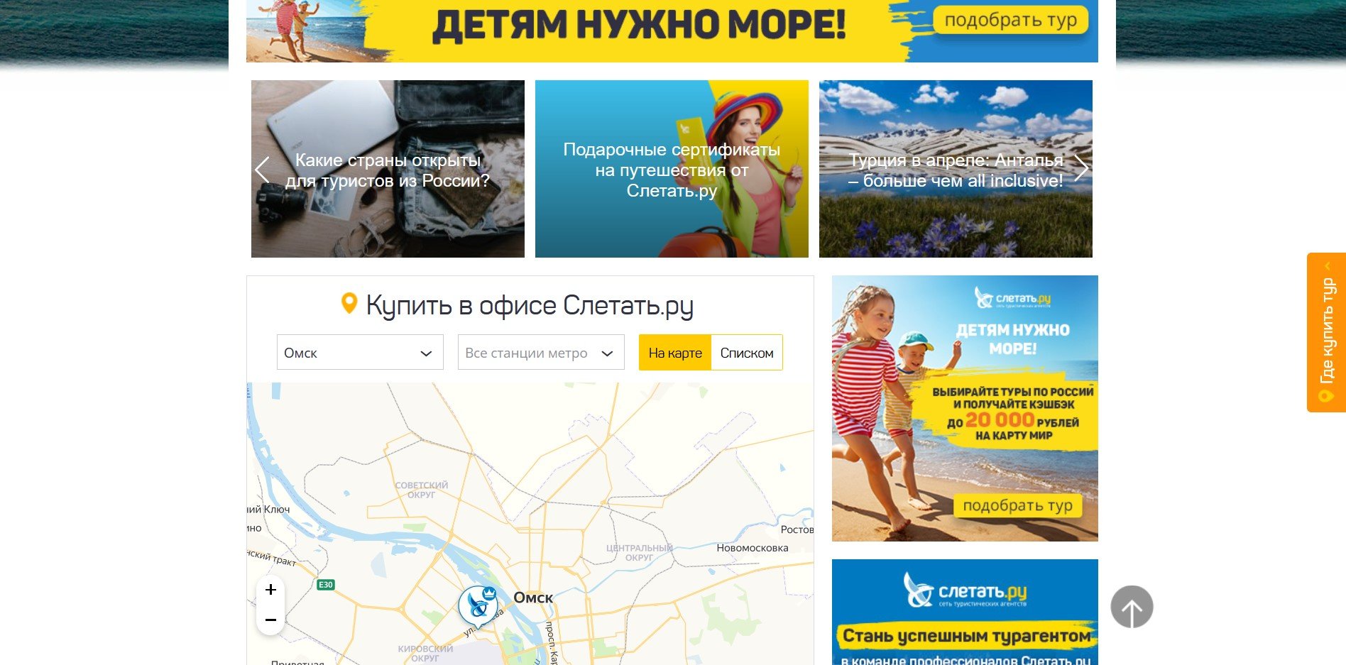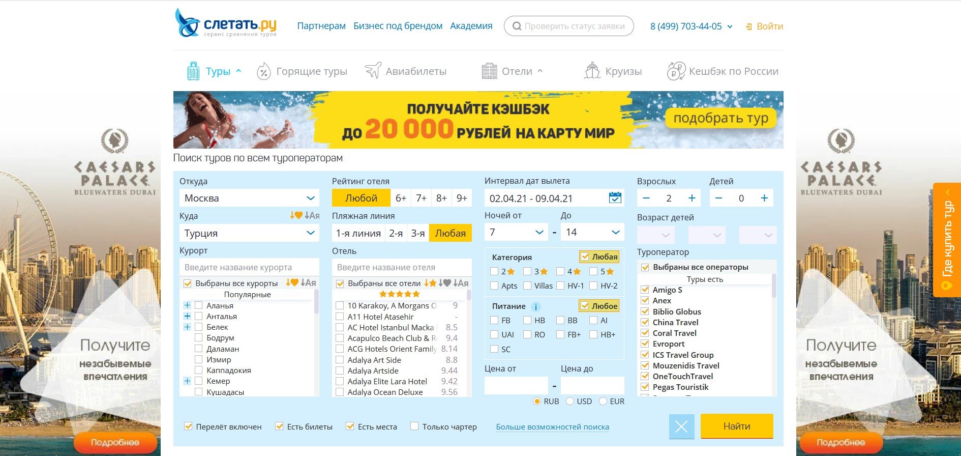 Слетать.ру – турагентство и система онлайн бронирования туров по всему миру. Можно подобрать тур или отель на любой вкус и подходящий по стоимости. Тур можно купить готовый или запланировать его самому. Для самостоятельных путешественников предусмотрено бронирование и покупка онлайн авиабилетов и номера в выбранном отеле.