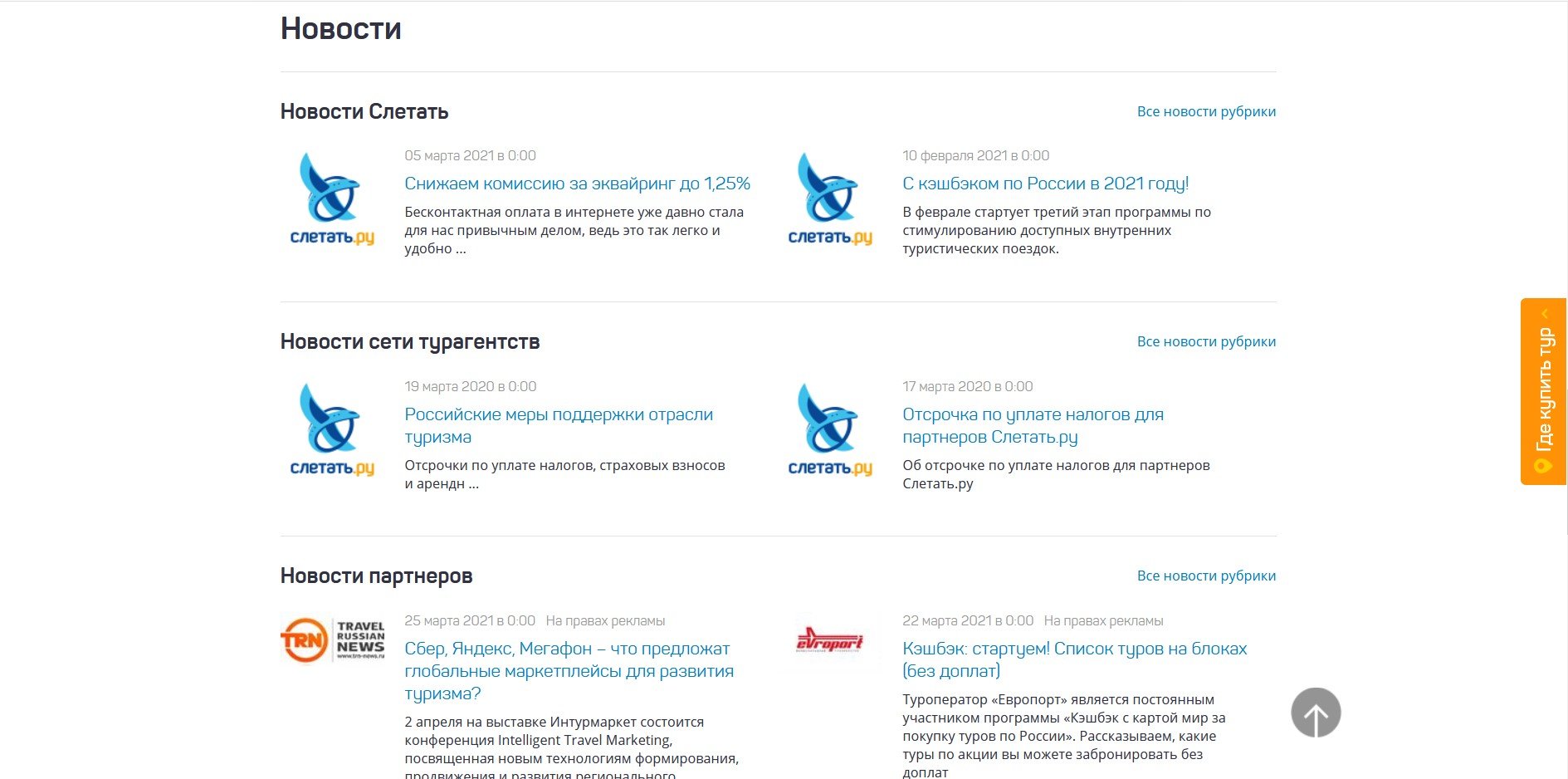 Слетать.ру – современная ИТ платформа поиска и бронирования туров, авиабилетов и отелей. Компания работает с 2010 года и имеет 575 офисов в 223 городах страны. Туры предоставляют 140 туроператоров. В день онлайн-сервис Слетать. ру посещают 1,5 миллиона пользователей. Для компаний есть выгодные предложения. Слетать. ру предлагает открыть офис по франшизе и имеет свою онлайн Академию, где можно получить актуальные знания для работы в турбизнесе.