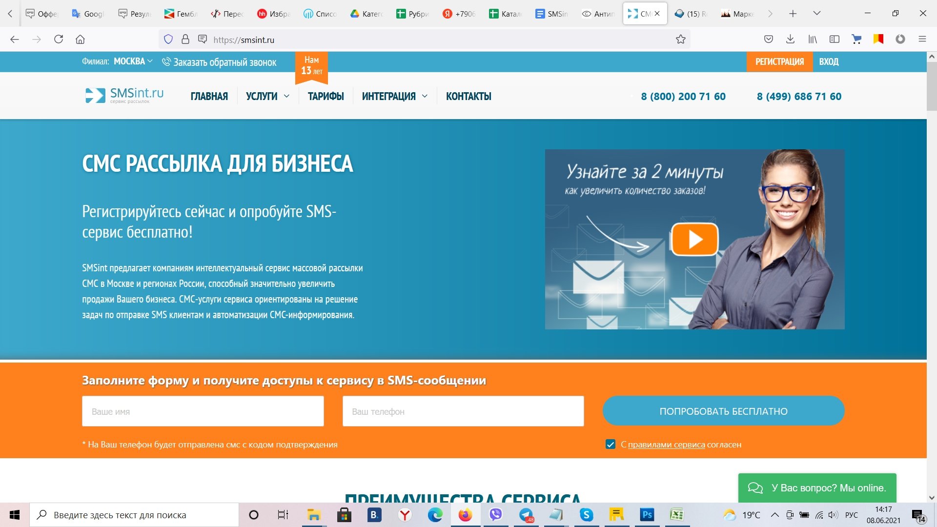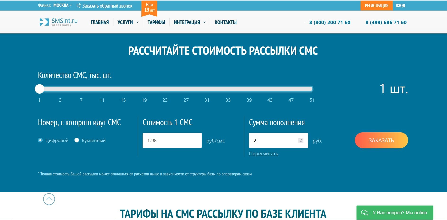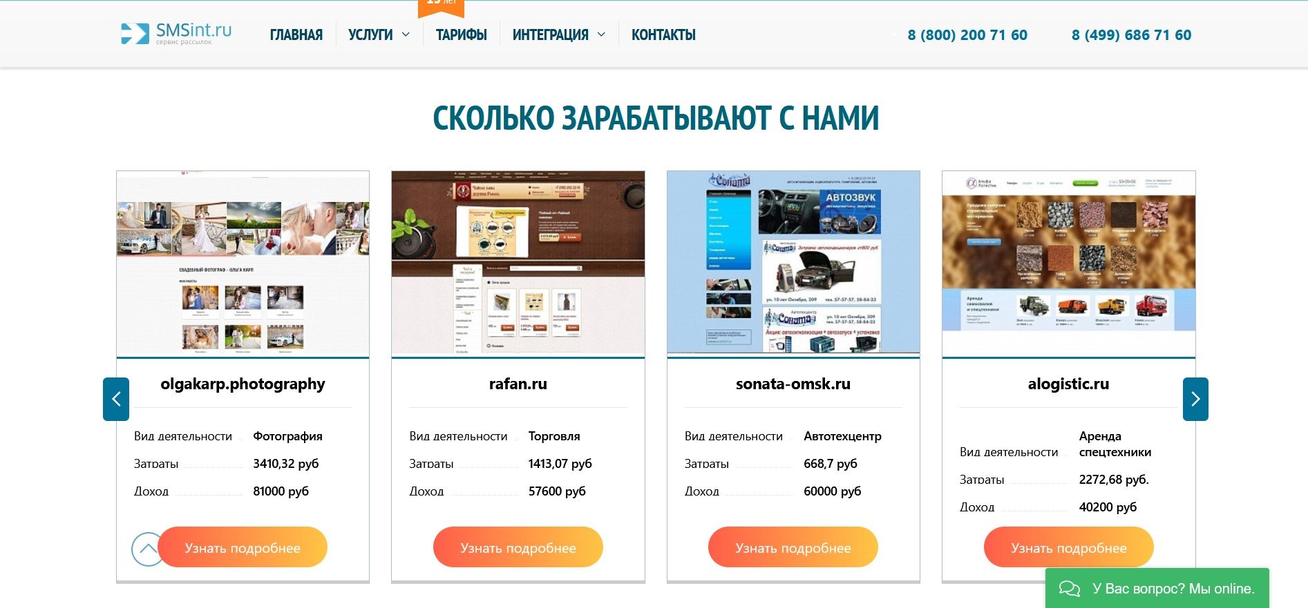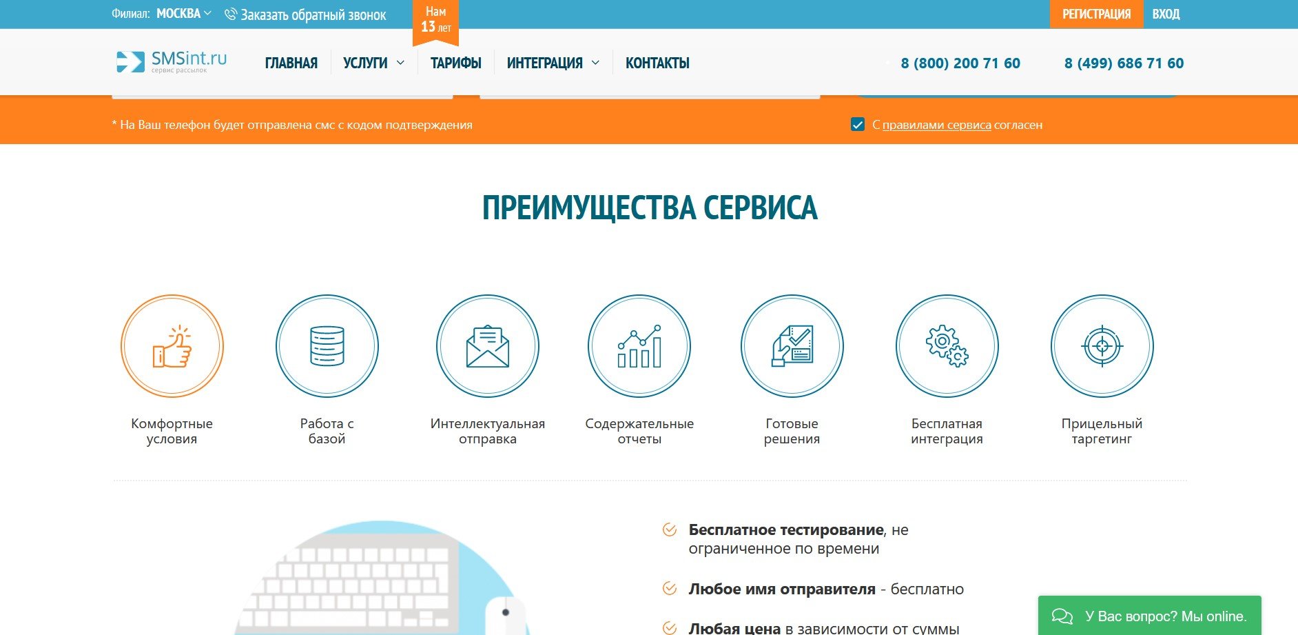 SMSint.ru предлагает следующие услуги: рассылка SMS, Viber, Whatsapp, автоматический обзвон, авторизация пользователей на сайте/в приложении с помощью звонка (стоимость одной успешной проверки всего 79 копеек), модуль онлайн-консультант для сайта