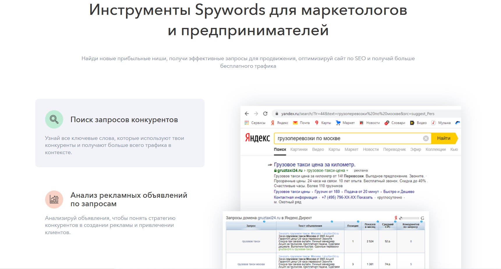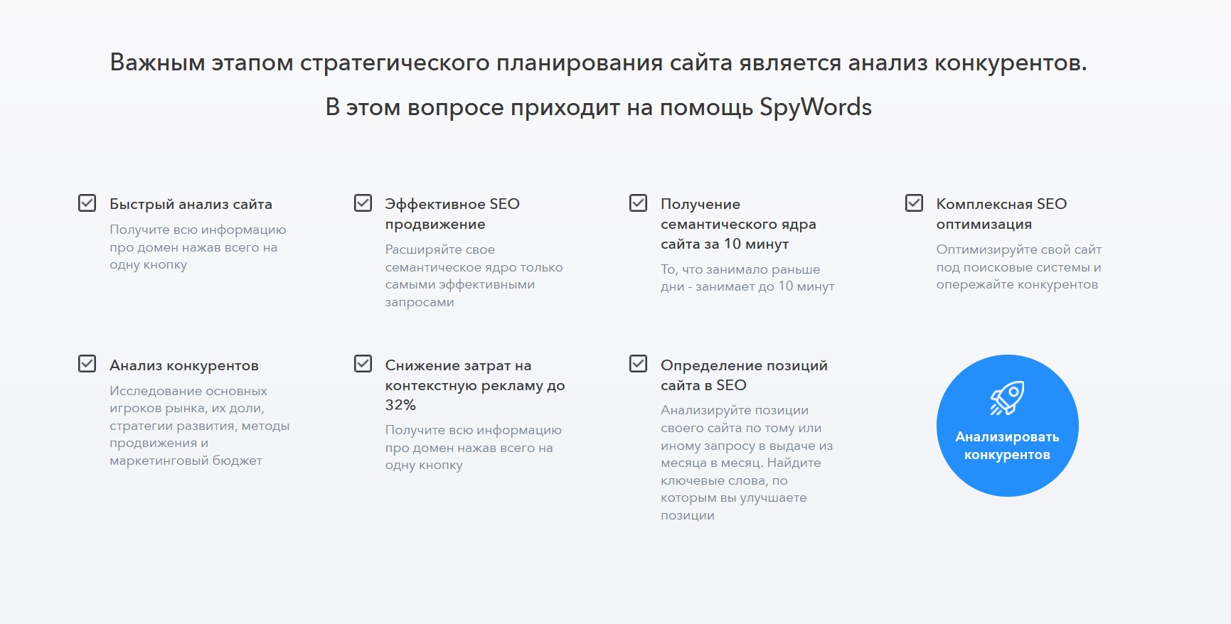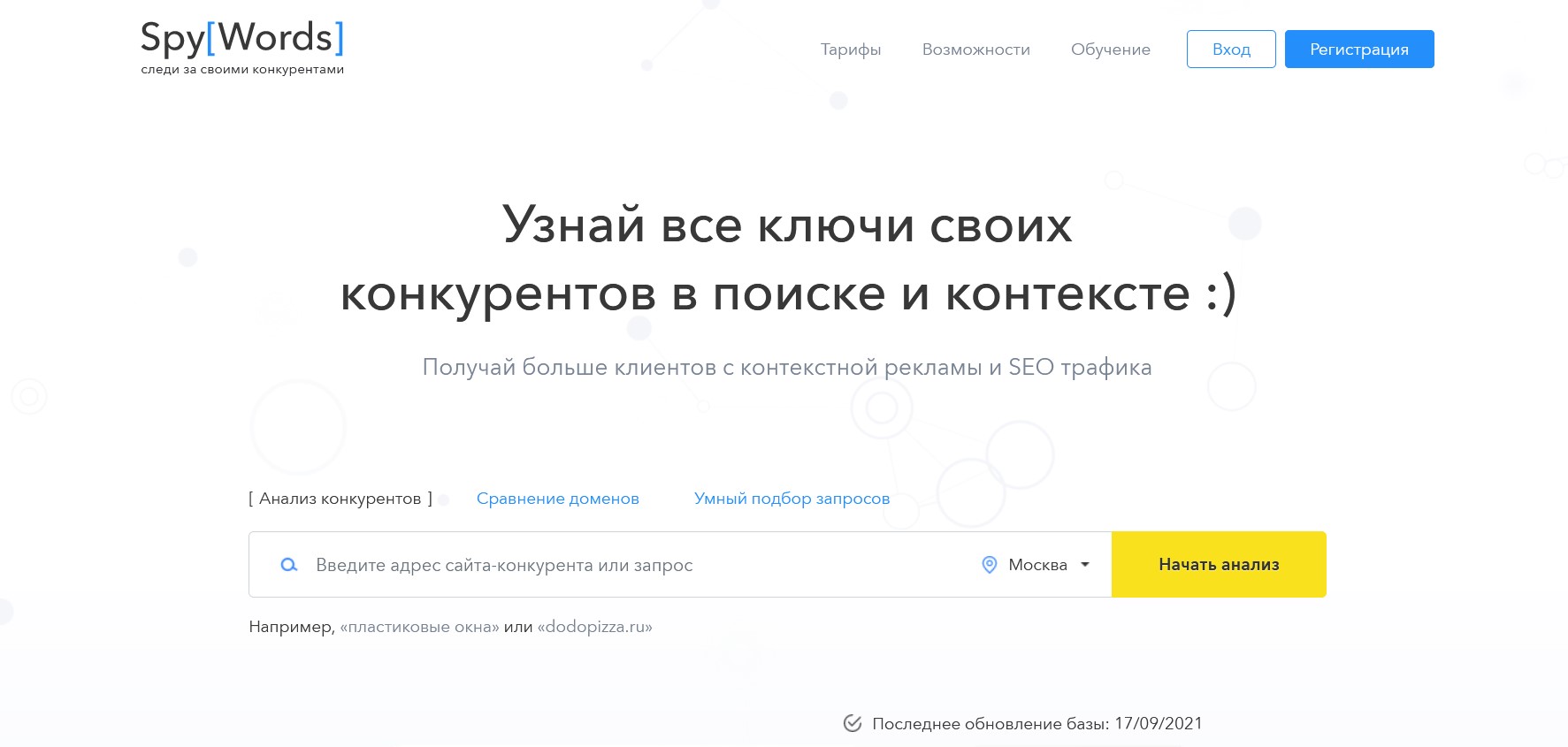 SpyWords это сервис анализа конкурентов в контекстной рекламе и в SEO-продвижении. Сервис помогает всегда оставаться в тренде и повышать результаты поисковой выдачи с помощью продвинутой аналитике. SpyWords предоставляет профессионалам в области интернет-маркетинга терабайты уникальной информации для анализа и оптимизации контекстных и seo-кампаний.