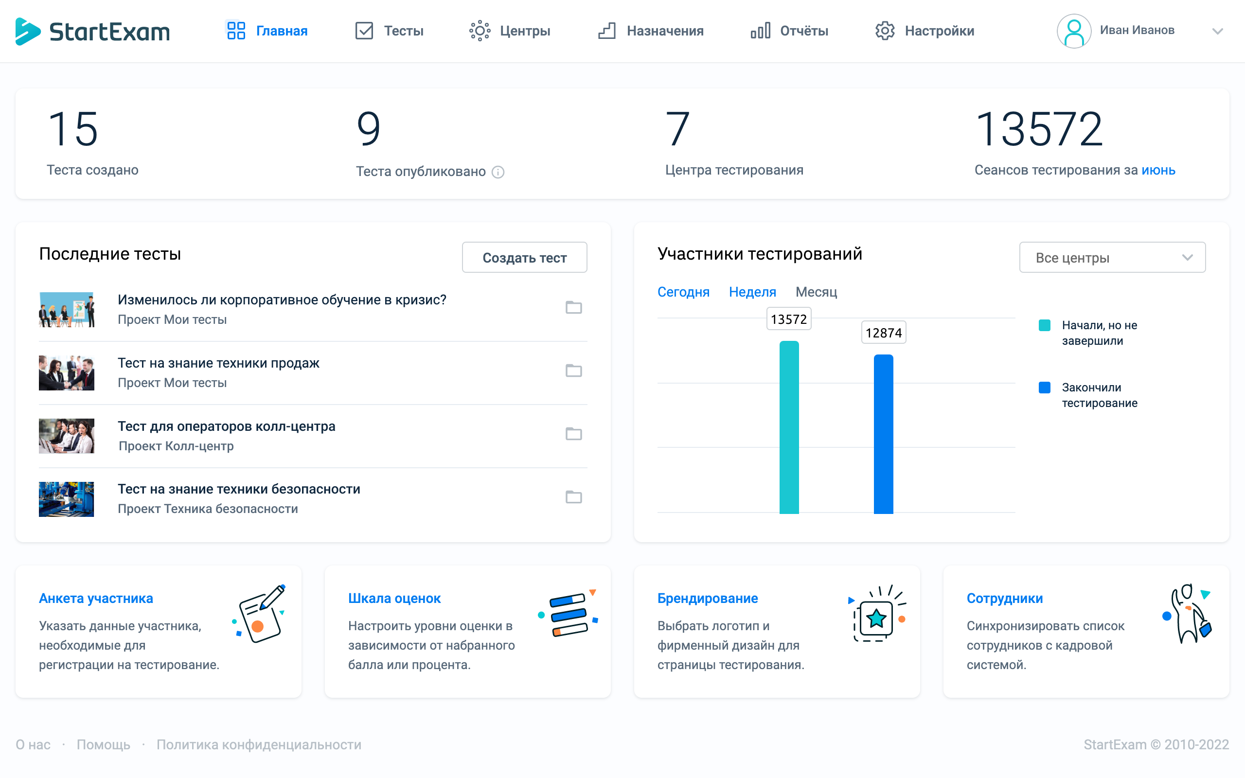 StartExam решит проблему с оценкой сотрудников и кандидатов. Позволяет конструировать разнообразные тесты для входящего тестирования, аттестации и оценки знаний для потребностей в обучении. Служба персонала может использовать сервис для решения всех задач оценки сотрудников.