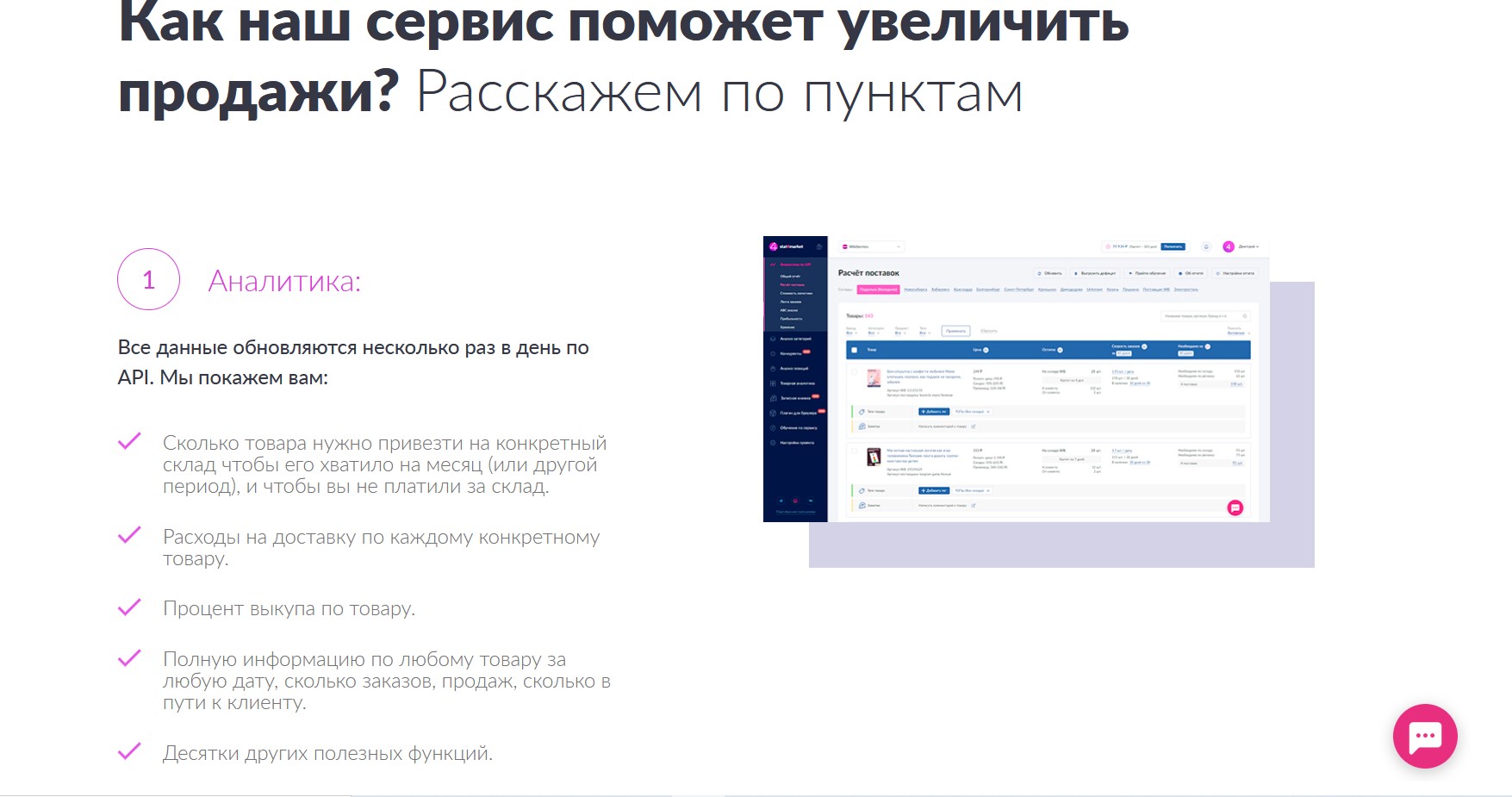 - Комплексная аналитика продаж на Wildberries и Ozon. В комплекс входит: статистика продаж по товарам, спрос, остатки; планирование поставок, стоимость доставки по товарам, процент выкупа, процент возврата, расчет прибыльности товара с учетом себестоимости, АВС анализ с остатками и динамикой, лента заказов с допродажами и сопутствующими товарами, регионы заказов.