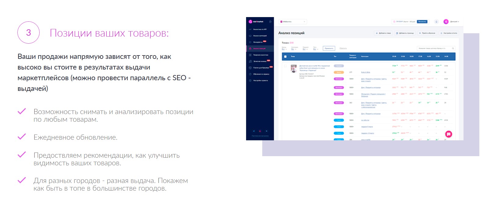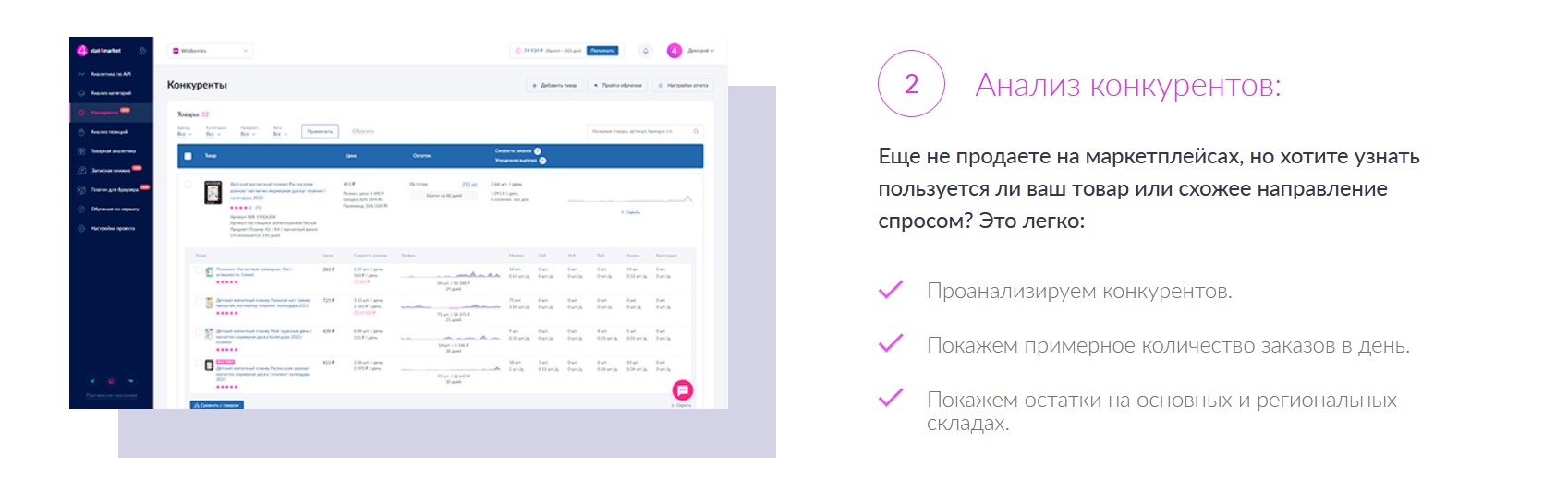 Stat4Market – сервис аналитики продаж для Ozon и WildBerries. Расширенная аналитика продаж, складских остатков, конкурентов, товаров, расчеты метрик эффективности помогут эффективному продвижению на самых посещаемых маркетплейсах.