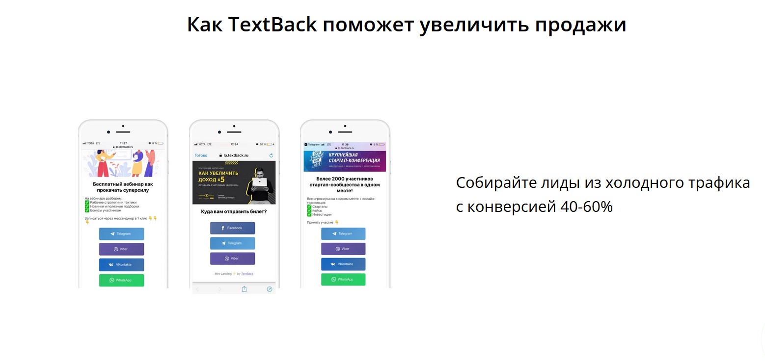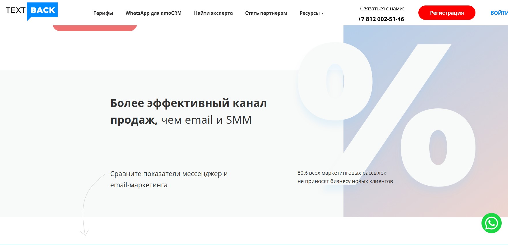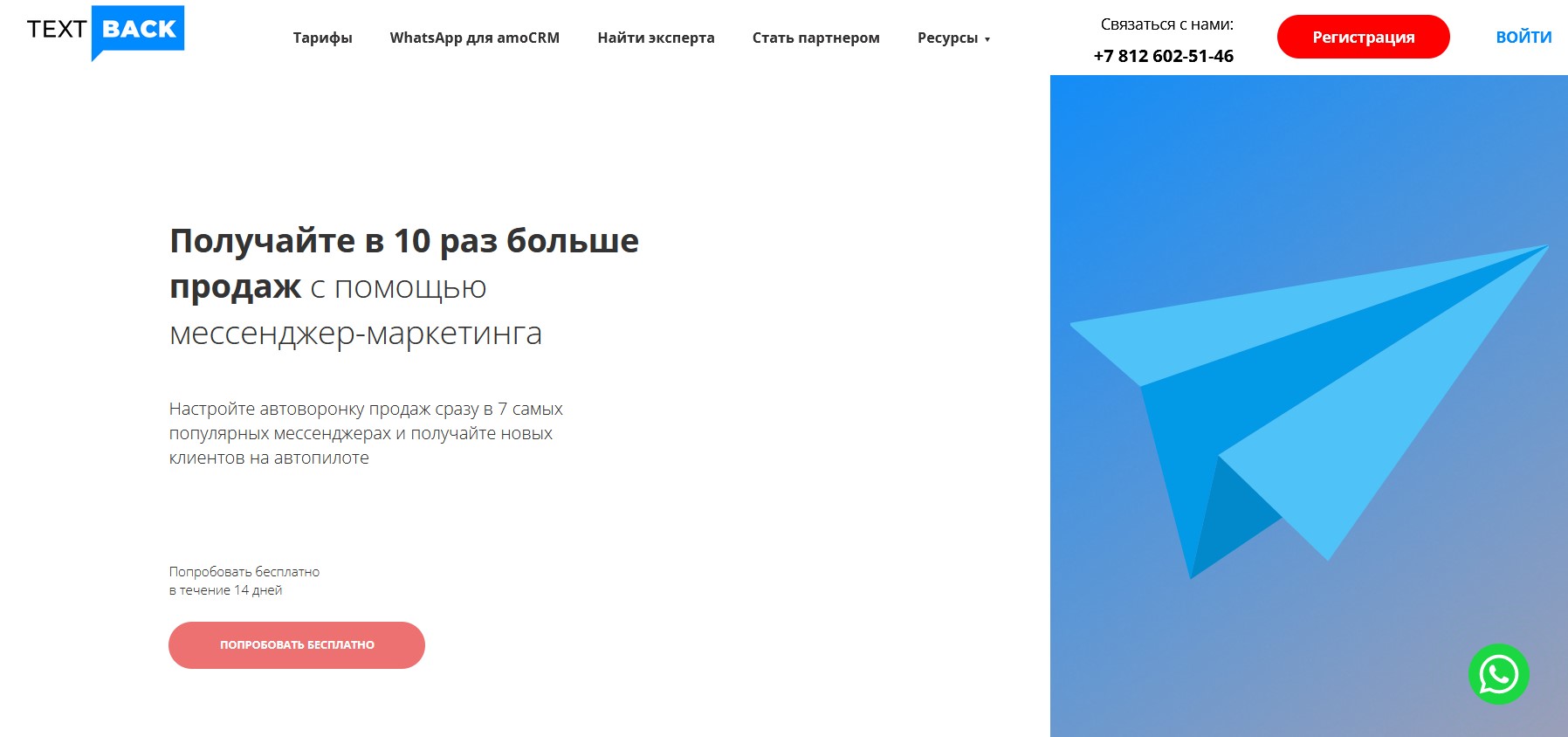 TextBack – сервис отправки рассылок в популярных мессенджерах. Конверсия лидов через холодный трафик составляет 40-60%. Рассылки помогут охватить тех клиентов, которые не читают письма и СМС. Бесплатный видеокурс, блог и кейсы дадут полное представление о возможностях сервиса.