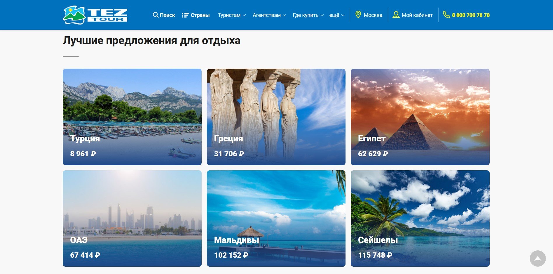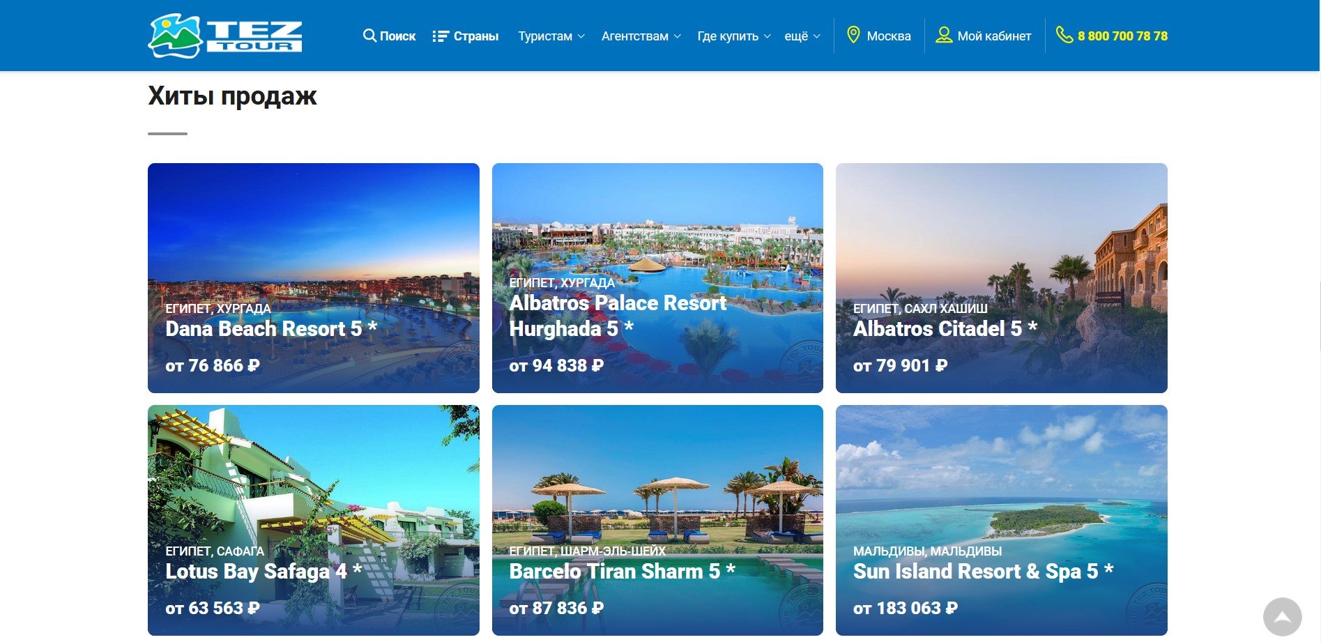 Tez Tour помогает путешественникам в выборе тура на любой вкус. Тур можно купить онлайн, а также выбрать отель, авиабилеты и заказать их на сайте. Для туристов есть сервисная поддержка, справочная информация. Периодические распродажи позволяет выбрать самое выгодное предложение.