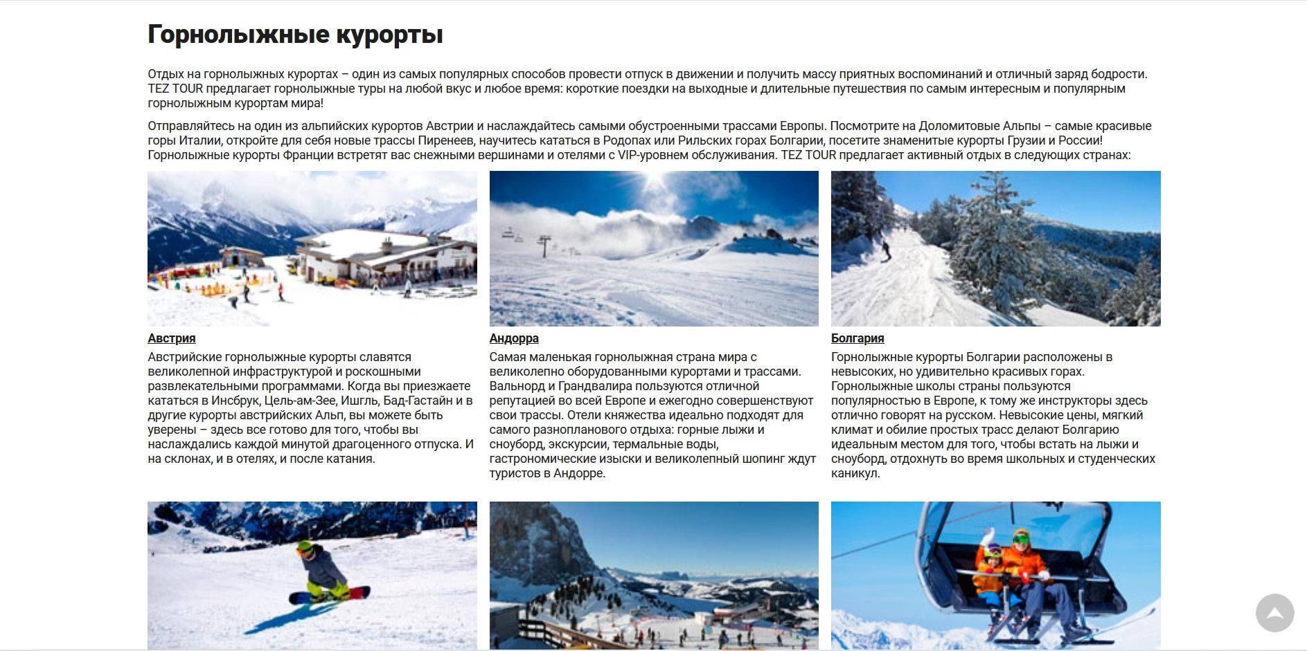 Tez Tour – ведущий туроператор, организующий поездки в разные страны мира. С момента основания в 1994 году постоянно развивает и расширяет деятельность в других странах каждый год, открывая новые офисы в Европе, Азии, Карибском бассейне и на Ближнем Востоке. Туристический сектор очень быстро развивается и меняется, поэтому Tez Tour возлагает большие надежды на интернет-технологии. На сайте можно заказать все услуги онлайн. Tez Tour постоянно работает над повышением качества и удобства онлайн-сервисов, доступных для партнеров, для туроператоров создан специальный портал. Tez Tour работает в более чем 30 странах мира.