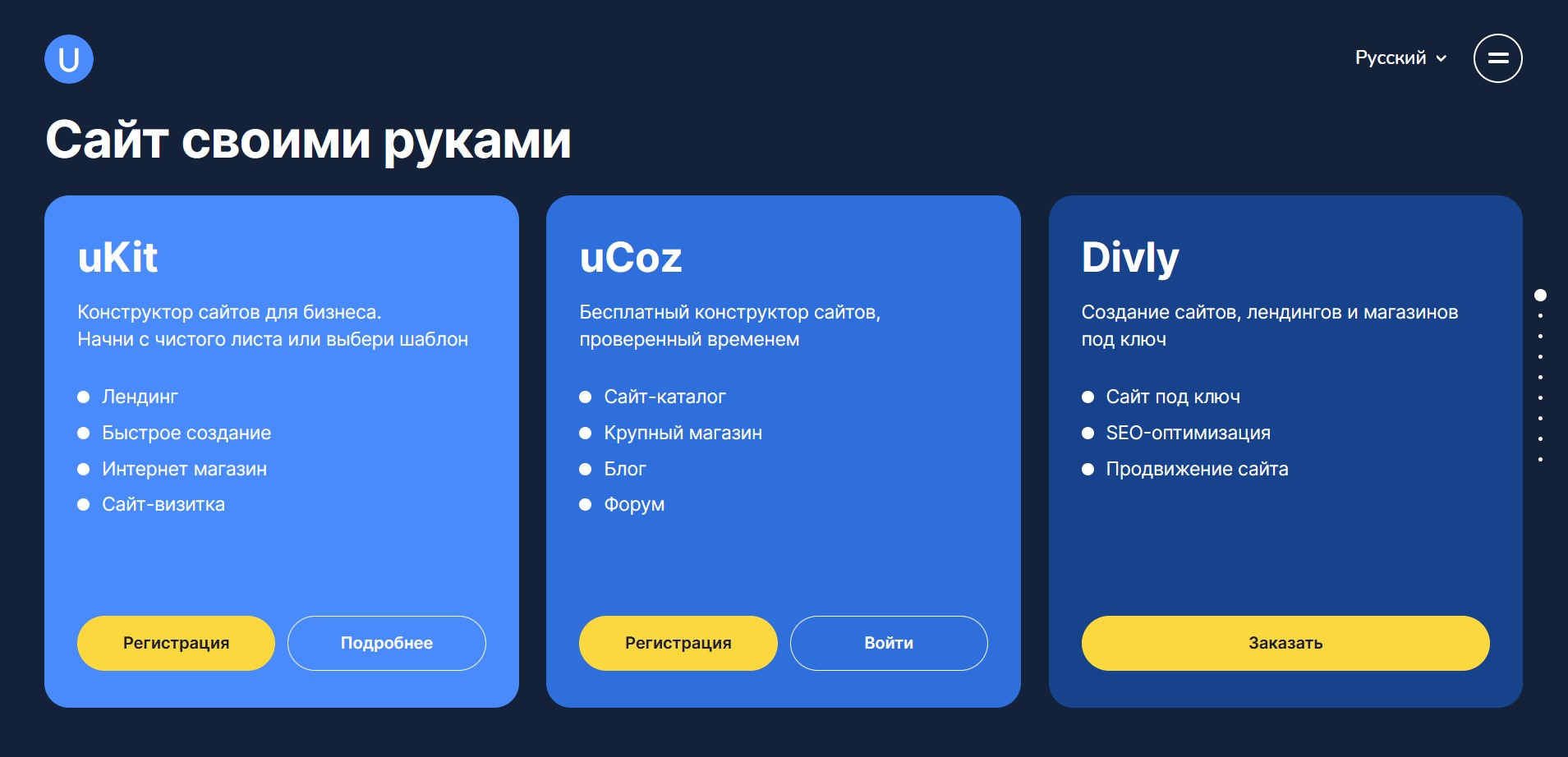 uCoz – это проверенный конструктор сайтов, позволяющий создавать любые сайты, лендинги, блоги, магазины. uCoz выпущен в 2005 году и его оценили уже миллионы пользователей, создавших сайты.