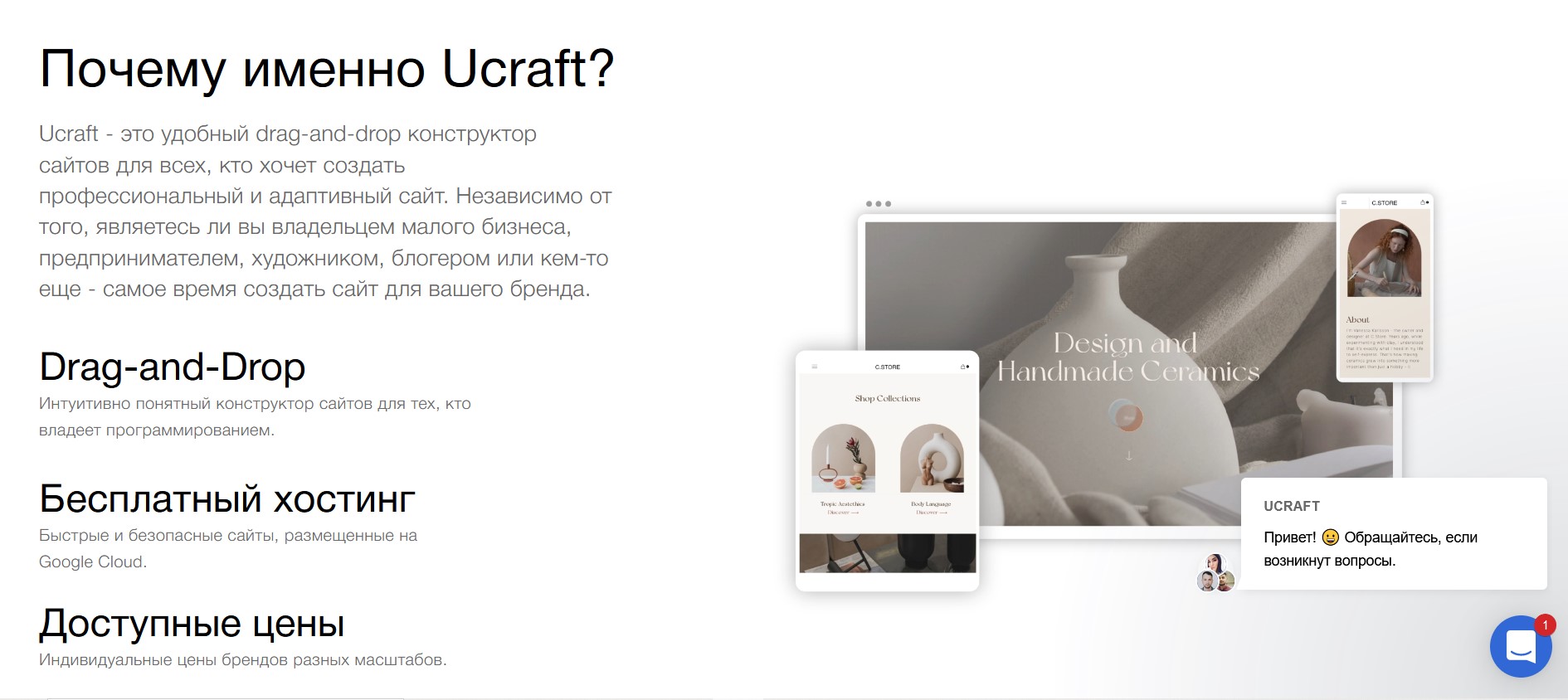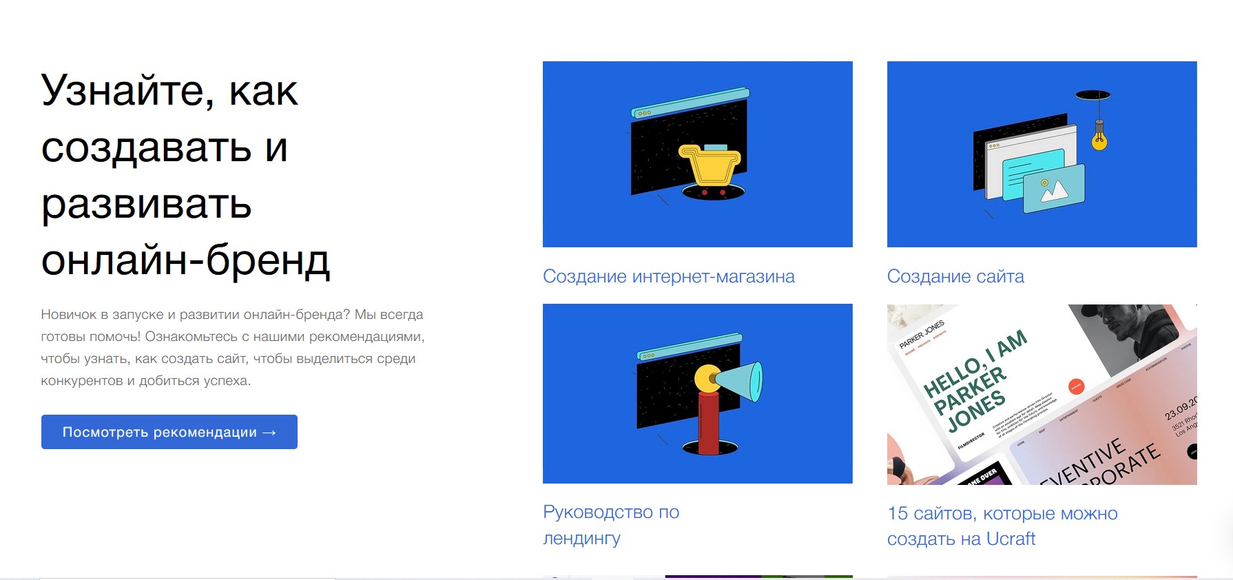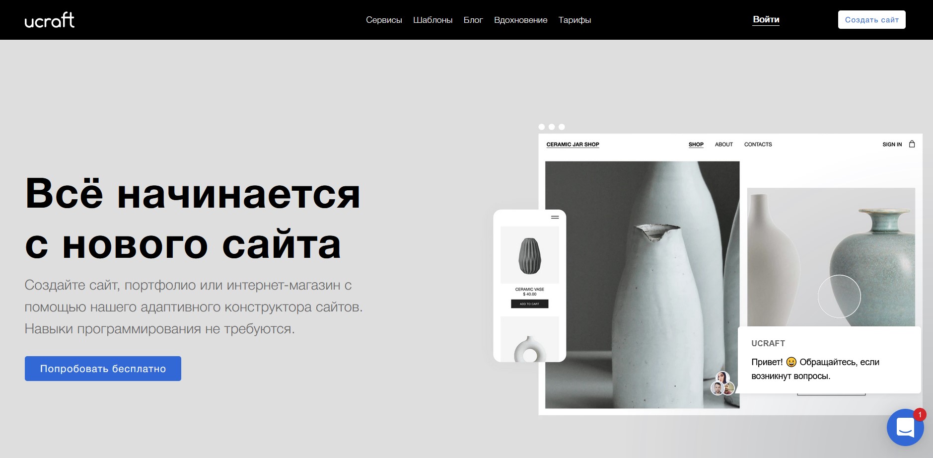 Ucraft – сервис, помогающий создать веб-сайт, портфолио, блог или интернет-магазин с помощью адаптивного визуального конструктора веб-сайтов. Опыт программирования не требуется.