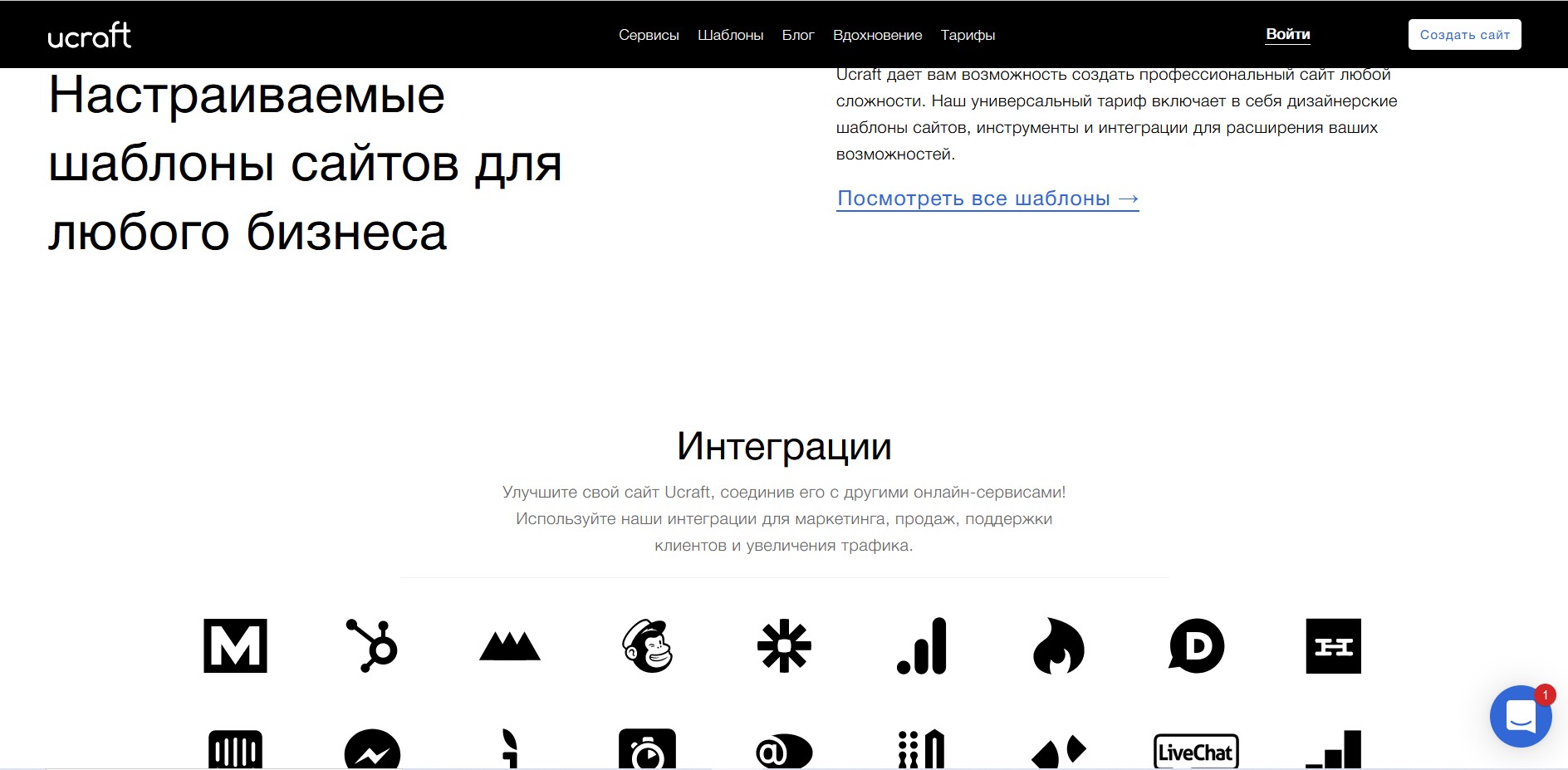 - Интеграции для маркетинговой деятельности, продаж, поддержки клиентов и увеличения трафика.