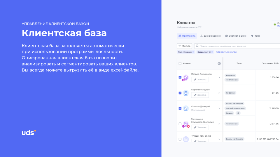 Внедрение UDS заняло 3 дня: 1 день на настройку, 2 — на обучение персонала. Используем систему для бонусного поощрения и реферальной программы. За 4 месяца база увеличилась на 1125 клиентов, а возврат стал выше на 28%. Отдельно отмечу встроенную аналитику — помогает отслеживать поведение пользователей. Единственное, чего не хватало — возможность массовой рассылки с более детальной фильтрацией, но обещают доработать.