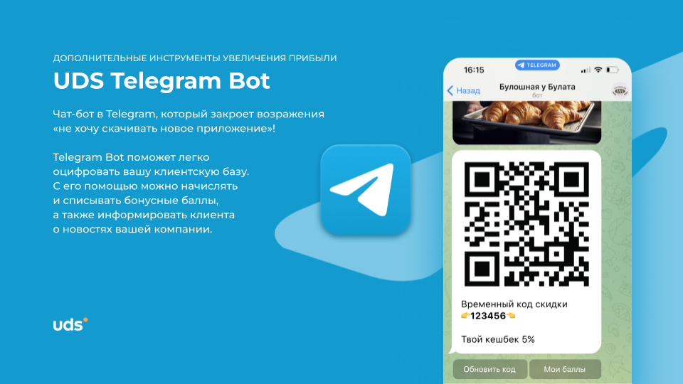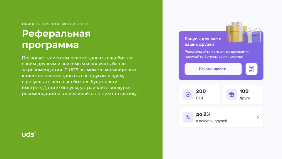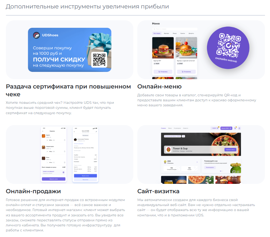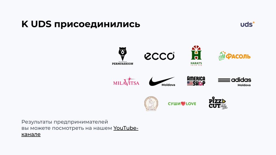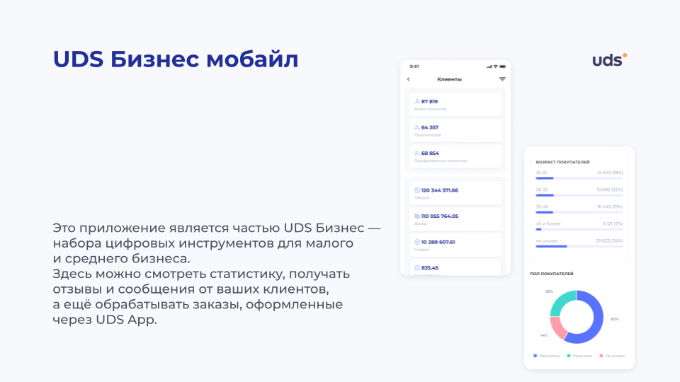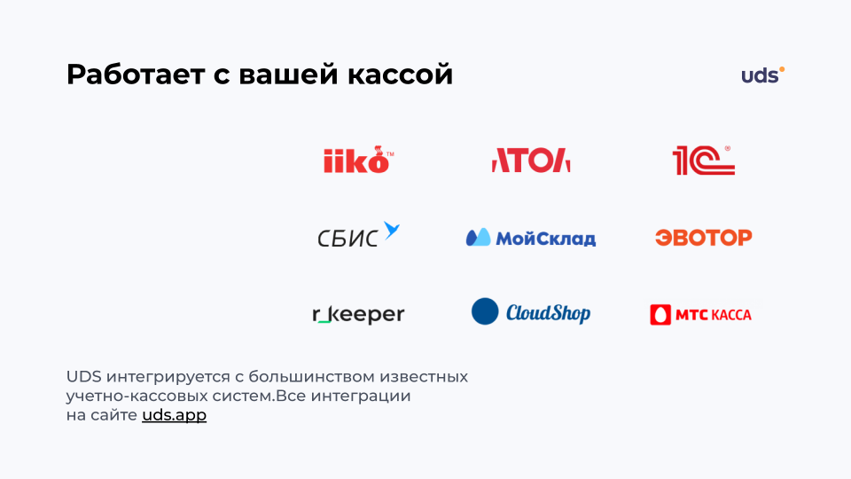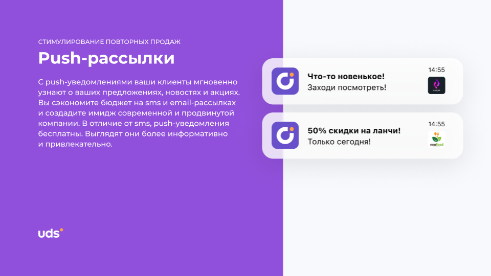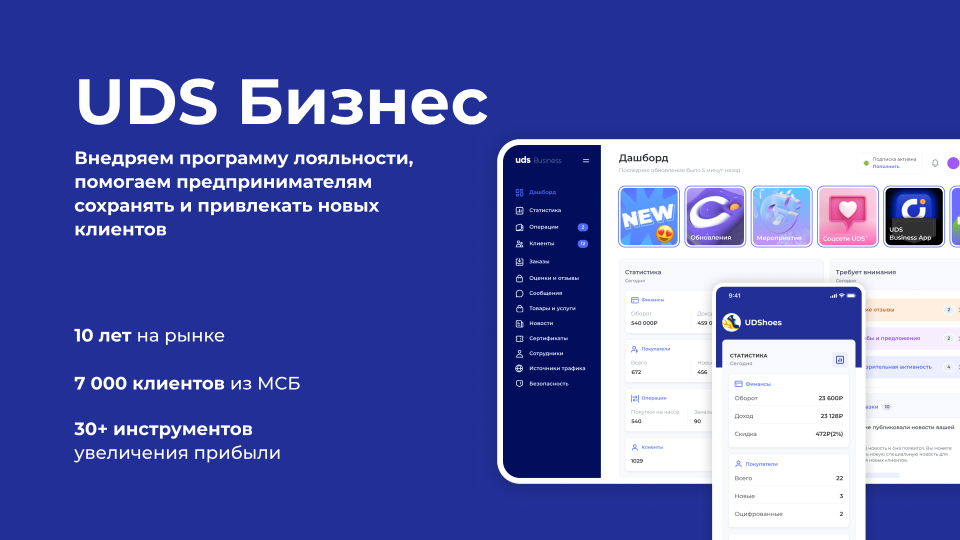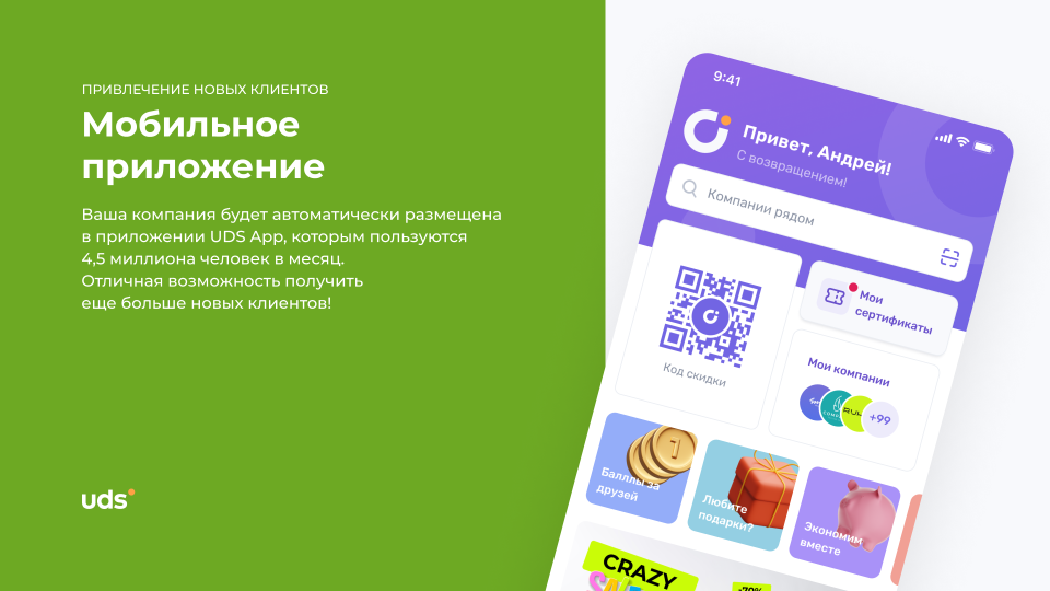 UDS — это универсальный сервис для малого и среднего бизнеса, который помогает удерживать клиентов и увеличивать выручку. Платформа работает с 2014 года и уже применяется более чем 7000 компаниями по всему миру. С помощью мобильного приложения и встроенных инструментов предприниматели могут запускать программы лояльности, использовать аналитику, принимать заказы и взаимодействовать с аудиторией. Решение особенно эффективно для офлайн-бизнесов, которым важно выстраивать повторные коммуникации и увеличивать количество возвратных покупок. Для покупателей UDS — это способ получать бонусы за покупки и использовать их на скидки, подарки и другие предложения от любимых брендов.