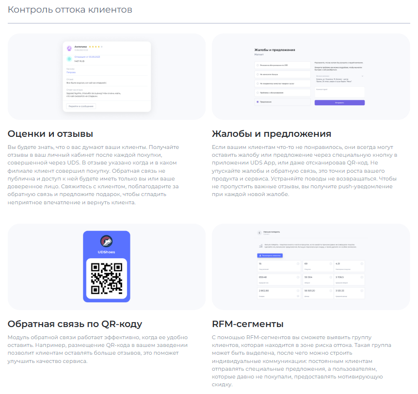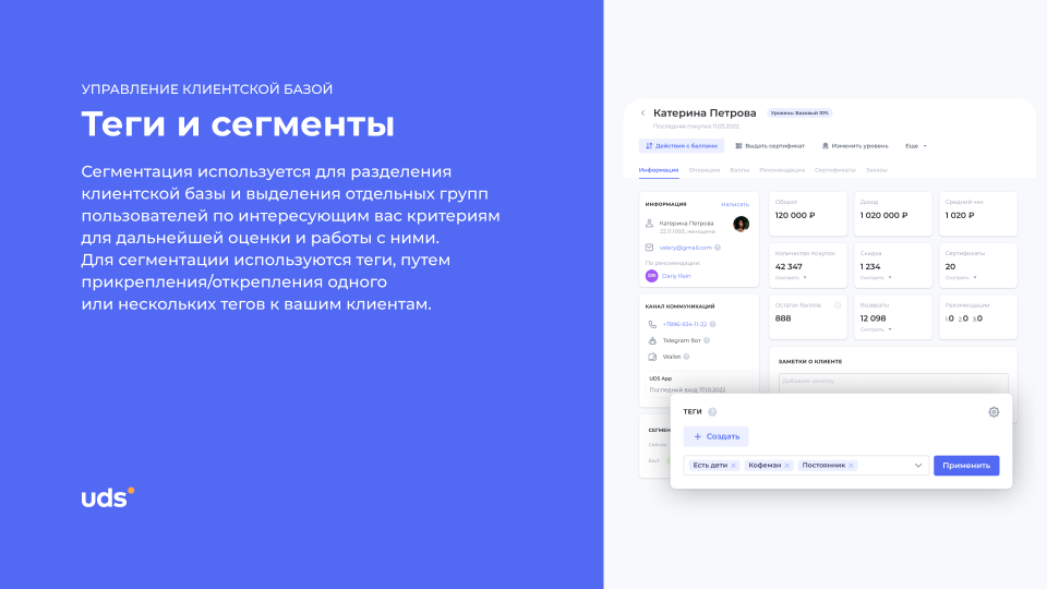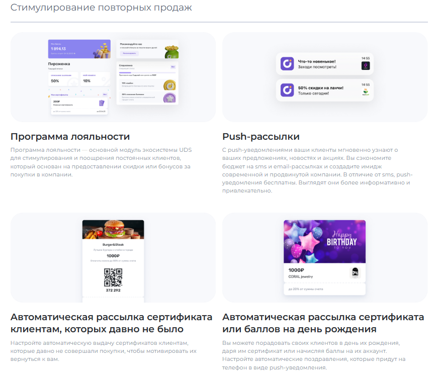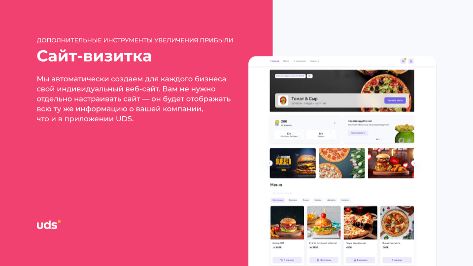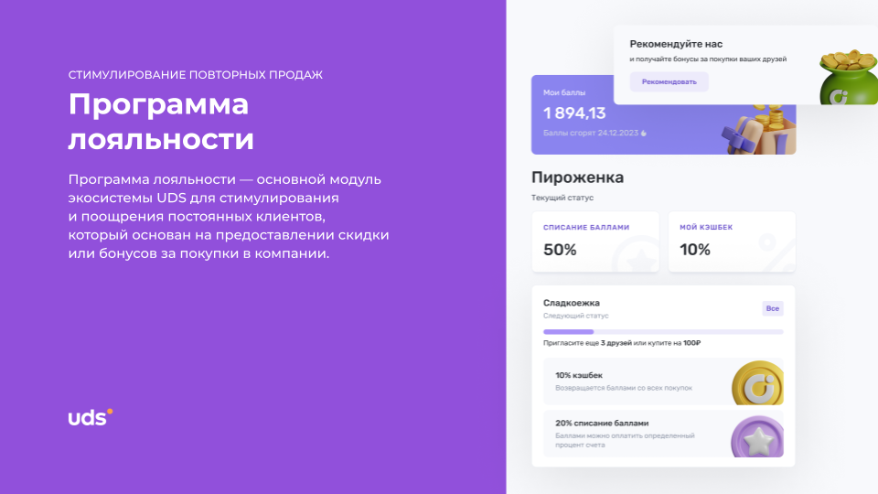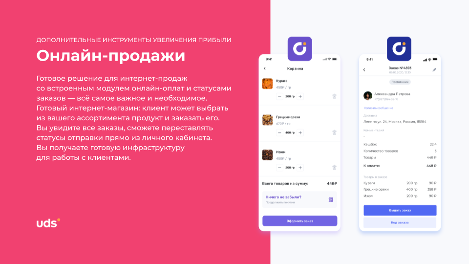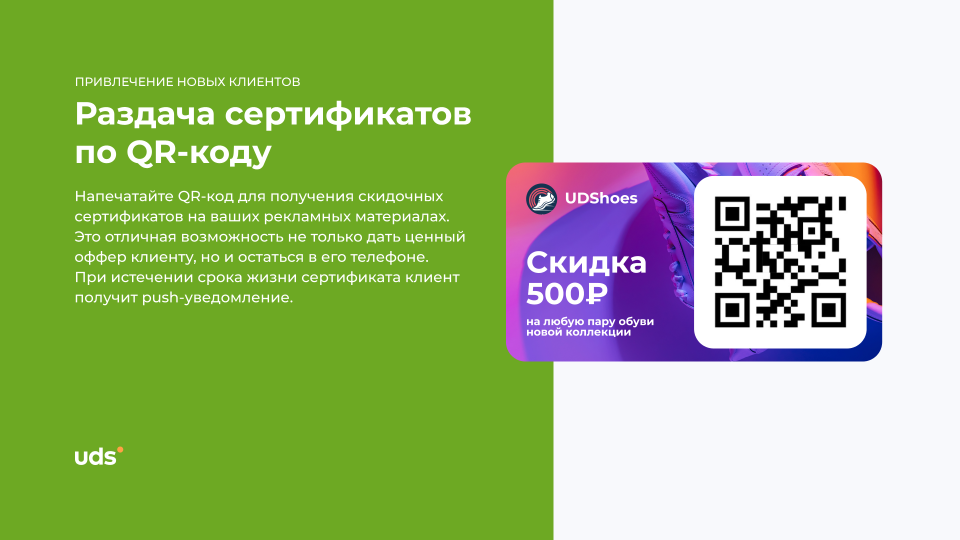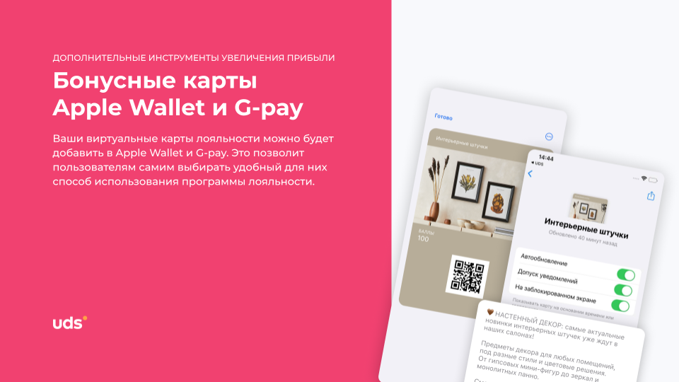 UDS — это универсальный сервис для малого и среднего бизнеса, который помогает удерживать клиентов и увеличивать выручку. Платформа работает с 2014 года и уже применяется более чем 7000 компаниями по всему миру. С помощью мобильного приложения и встроенных инструментов предприниматели могут запускать программы лояльности, использовать аналитику, принимать заказы и взаимодействовать с аудиторией. Решение особенно эффективно для офлайн-бизнесов, которым важно выстраивать повторные коммуникации и увеличивать количество возвратных покупок. Для покупателей UDS — это способ получать бонусы за покупки и использовать их на скидки, подарки и другие предложения от любимых брендов.
