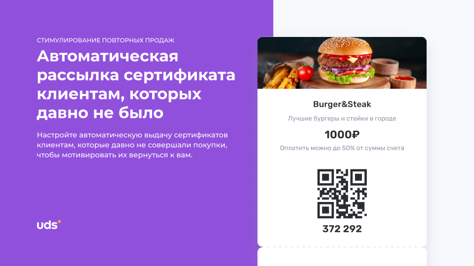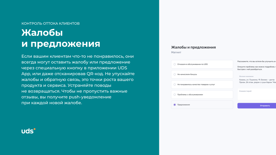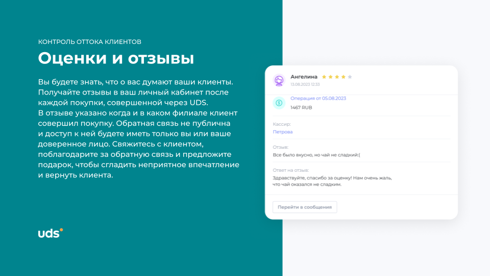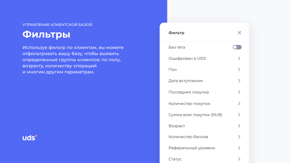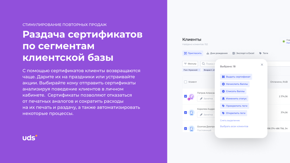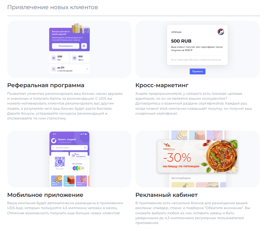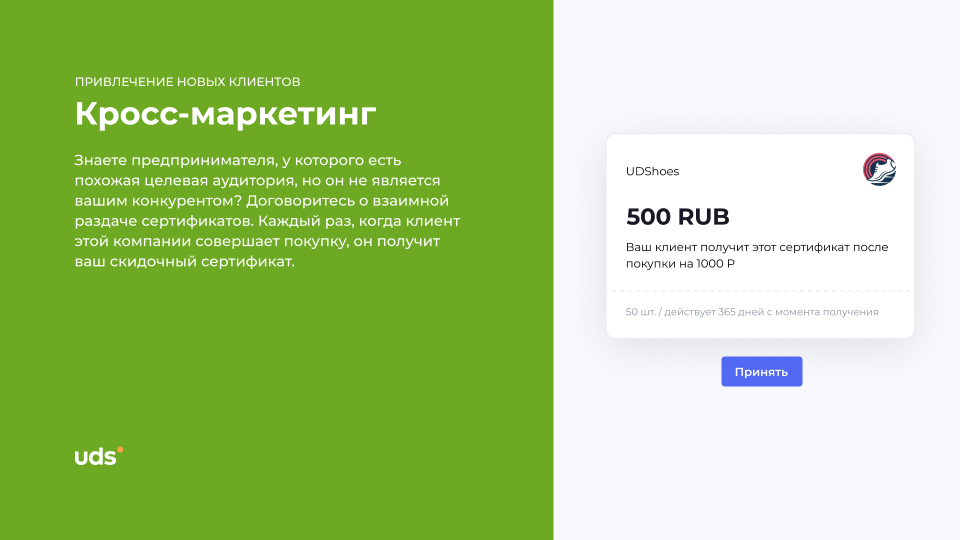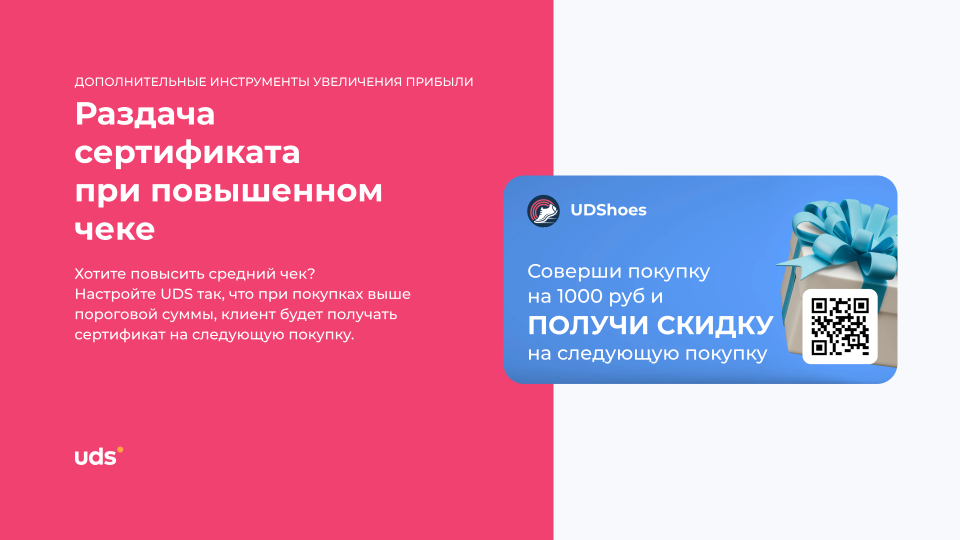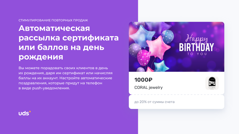 UDS — это универсальный сервис для малого и среднего бизнеса, который помогает удерживать клиентов и увеличивать выручку. Платформа работает с 2014 года и уже применяется более чем 7000 компаниями по всему миру. С помощью мобильного приложения и встроенных инструментов предприниматели могут запускать программы лояльности, использовать аналитику, принимать заказы и взаимодействовать с аудиторией. Решение особенно эффективно для офлайн-бизнесов, которым важно выстраивать повторные коммуникации и увеличивать количество возвратных покупок. Для покупателей UDS — это способ получать бонусы за покупки и использовать их на скидки, подарки и другие предложения от любимых брендов.