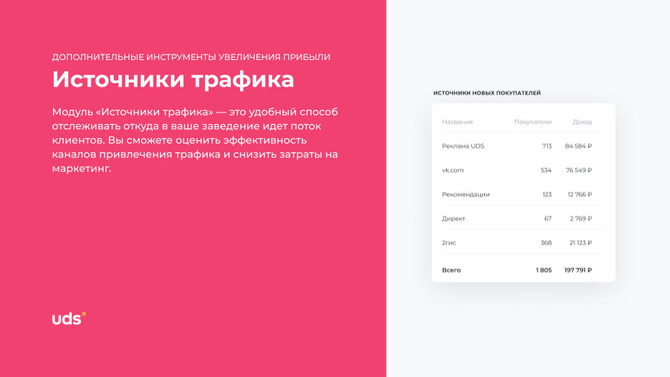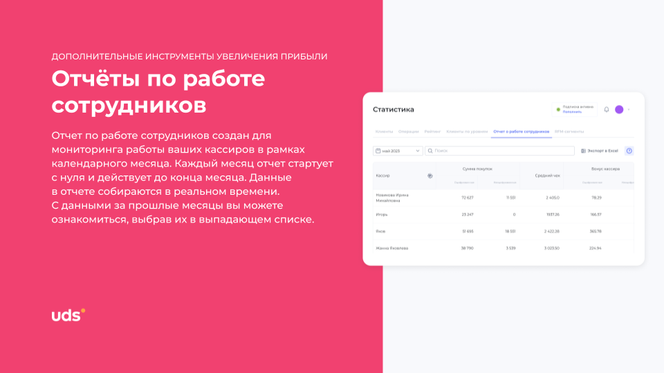 Подключили UDS в октябре. Сразу настроили бонусы 5% за покупку и 3% за рекомендацию. За 5 месяцев прирост выручки — +14%. Чек выше, повторных покупок больше. Просто и удобно.