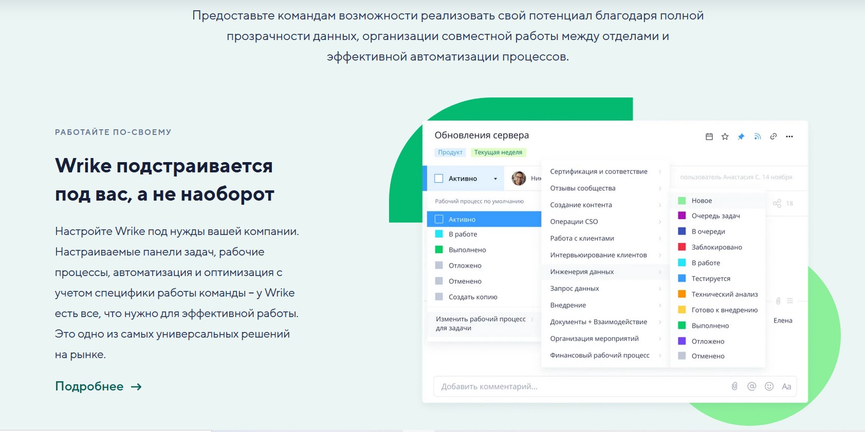 - Wrike можно легко настроить для любого отдела, команды или стиля работы, что позволяет планировать, управлять и выполнять работу в любом масштабе.