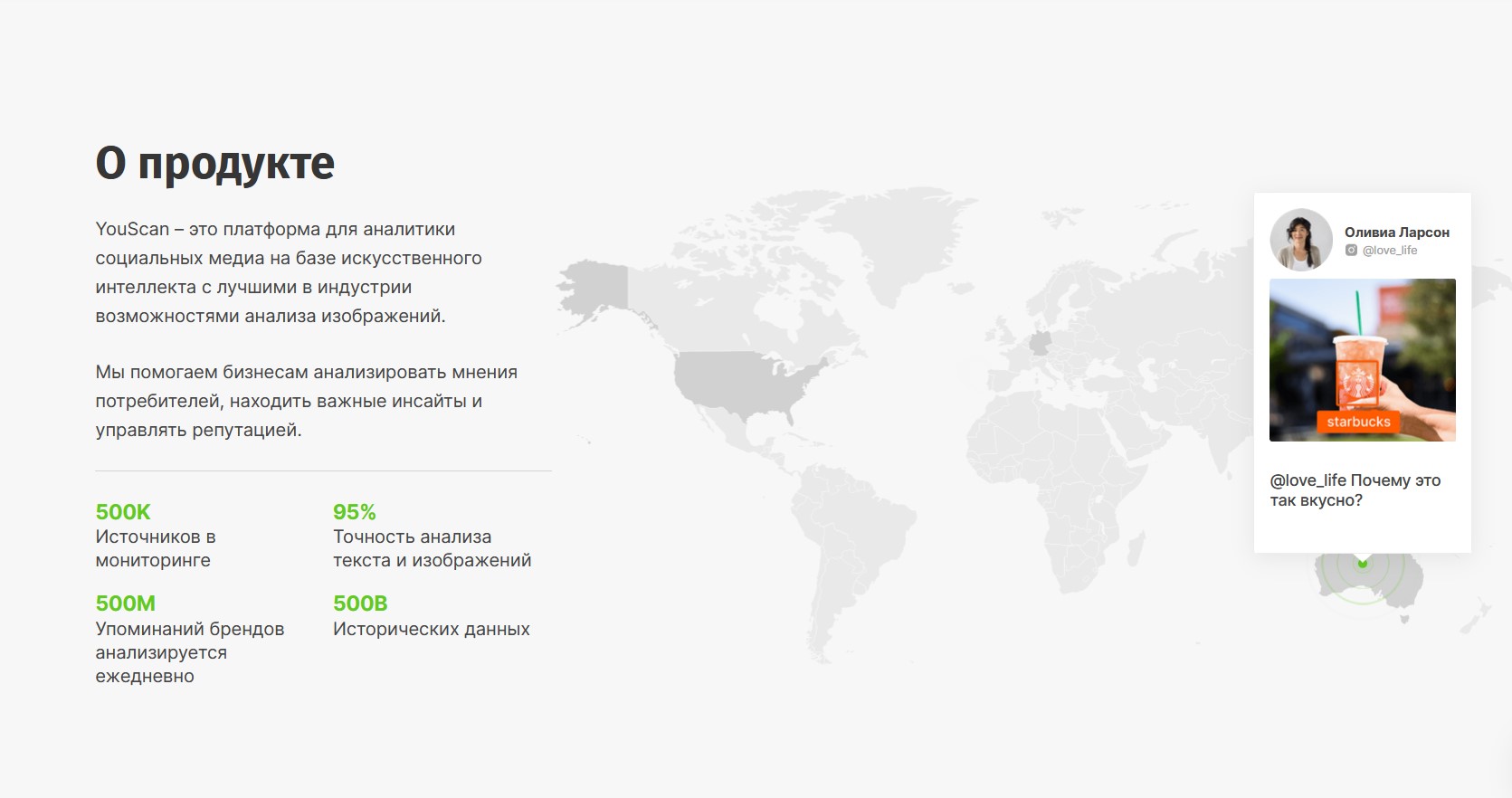 YouScan – это платформа для анализа социальных сетей на базе искусственного интеллекта с лучшими в отрасли возможностями распознавания изображений.