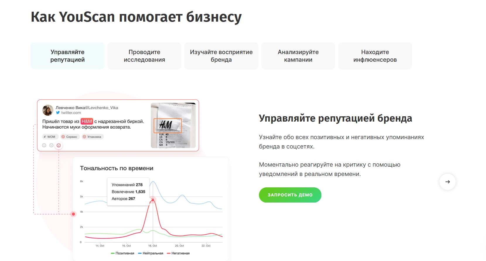 - YouScan предлагает Aina. Этот виртуальный аналитик данных на основе искусственного интеллекта автоматически предоставляет важную информацию и оповещения о клиентах. Обсуждение бренда в социальных сетях.