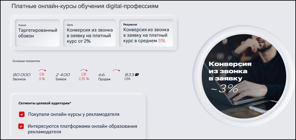 - Более 200 фильтров для настройки сегментации аудитории для рекламы на основе звонков и просматриваемых ресурсов в сети.