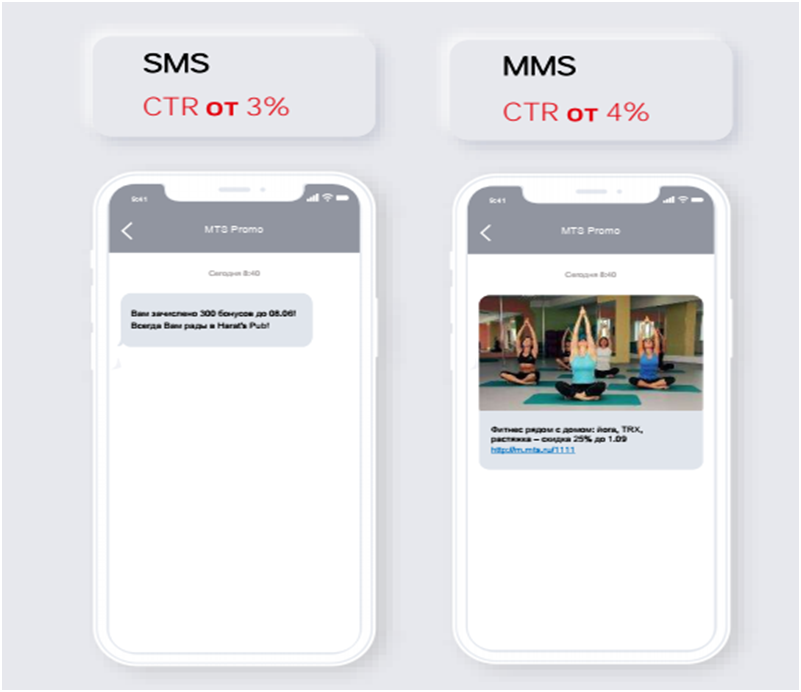 - Таргетированные RCS-рассылки. RCS приходит как СМС, только с дополнительной визуализацией в виде картинок и кнопок для перехода.