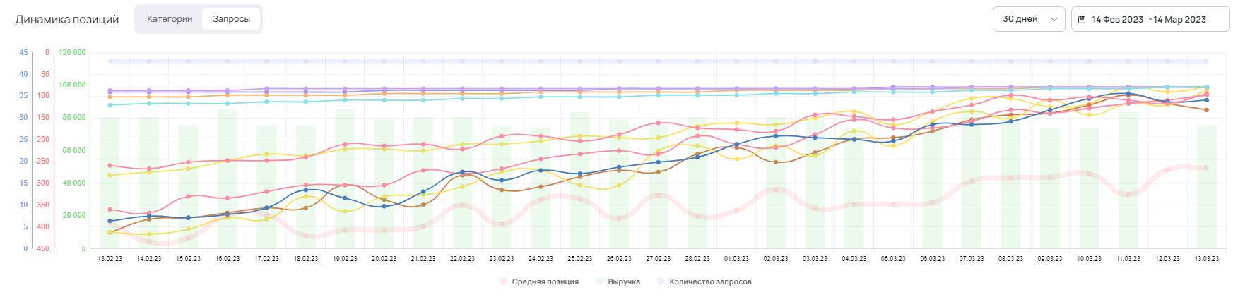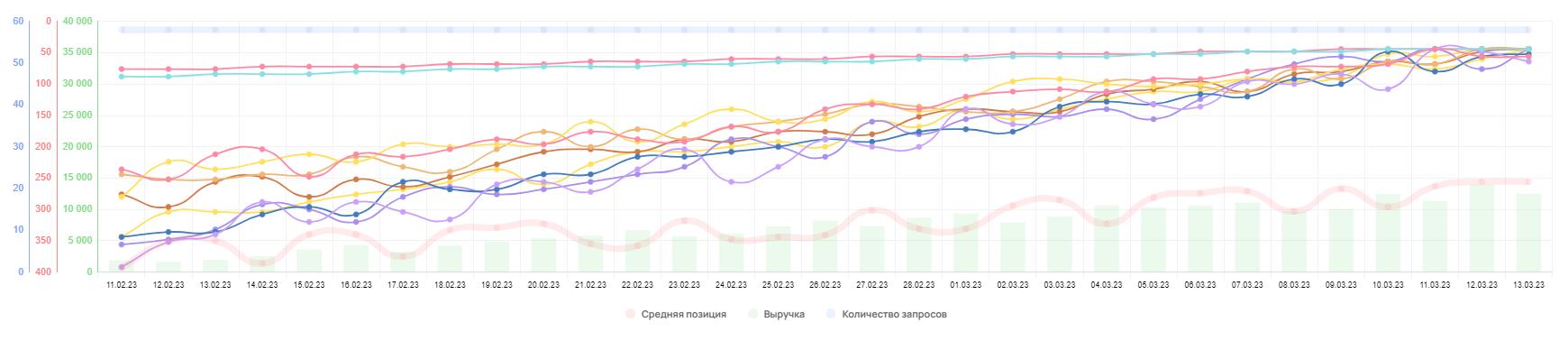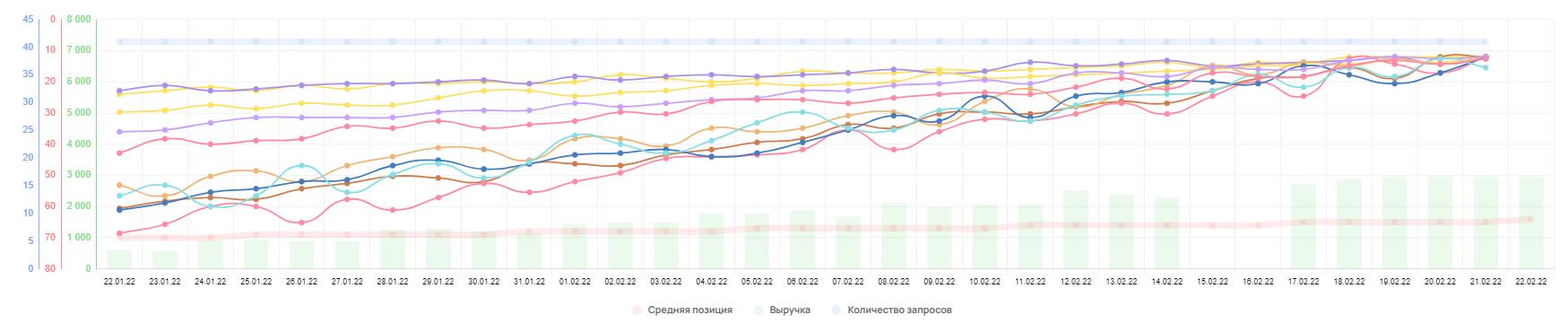 Стало: заполненная карточка товара. Рост индексации ключевых запросов за неделю при помощи сервиса. Оптимизация карточки была произведена 14 февраля.